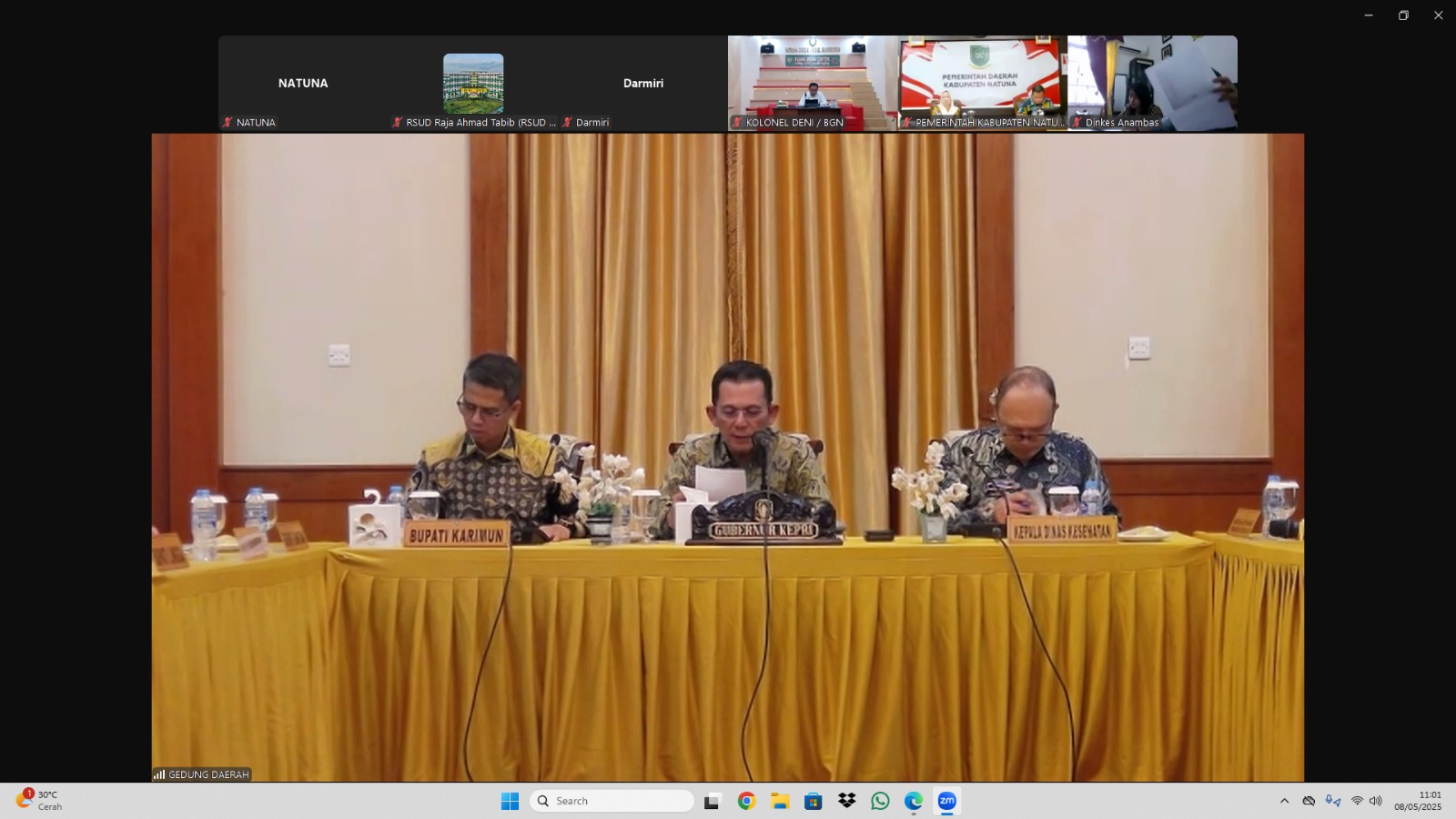 (wartaKominfo) – Bupati Natuna, Cen Sui Lan mengikuti Rapat Koordinasi (Rakor) secara virtual yang dipimpin langsung oleh Gubernur Kepulauan Riau, Ansar Ahmad. Rapat ini membahas sejumlah isu strategis di bidang kesehatan, di antaranya kekurangan dokter spesialis di RSUD kabupaten/kota, pelaksanaan program makan bergizi gratis, serta penanganan stunting di Provinsi Kepulauan Riau. Kamis, 08/5/2025.