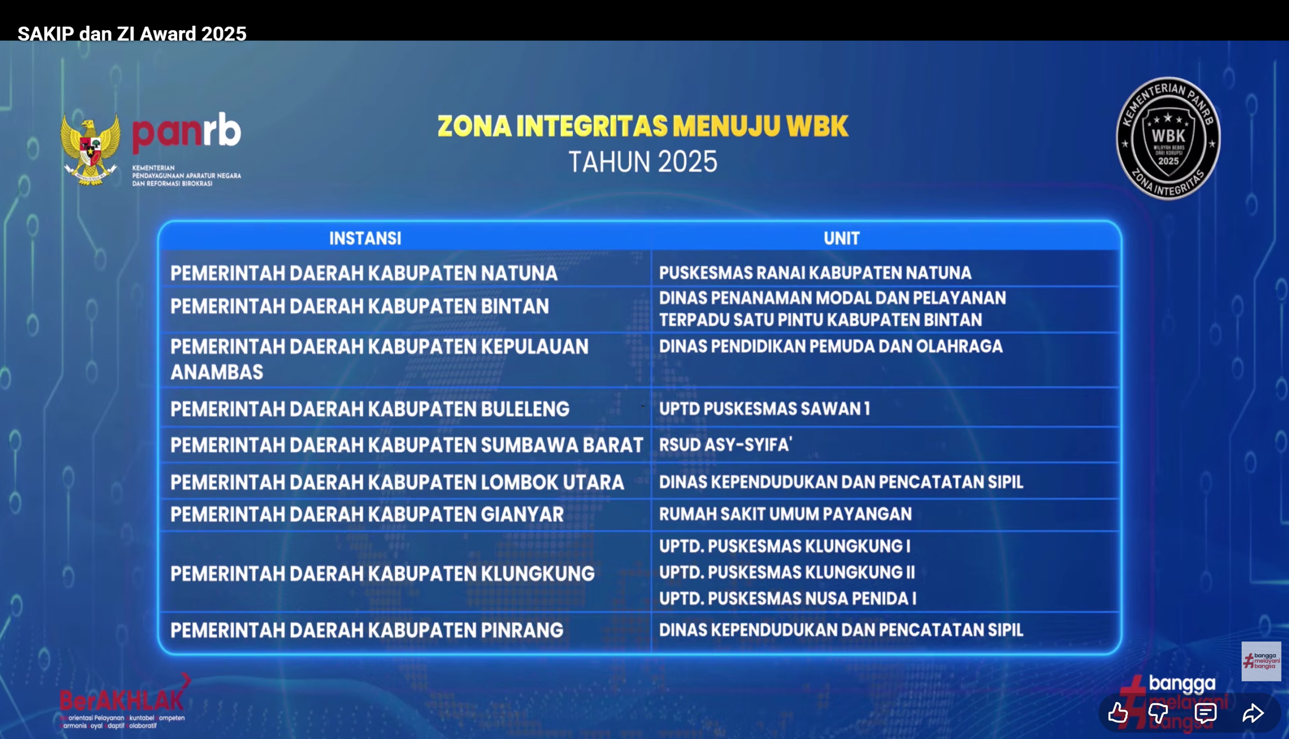 Berdasarkan hasil evaluasi nasional tahun 2025, tercatat sebanyak 312 unit kerja memperoleh predikat Zona Integritas menuju WBK/WBBM. Salah satu di antaranya adalah unit kerja Pemerintah Kabupaten Natuna, yaitu Puskesmas Ranai.
