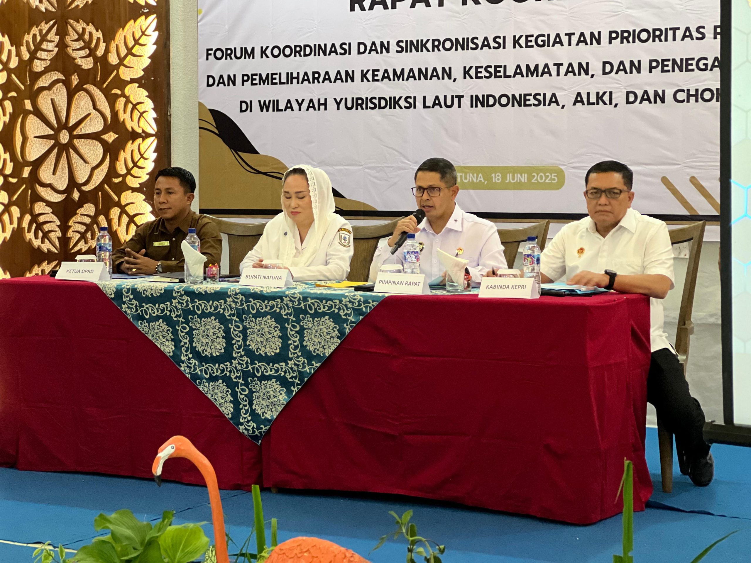 (wartaKominfo) – Bupati Natuna, Cen Sui Lan bersama Wakil Bupati, Jarmin mengikuti kegiatan Rapat Koordinasi Forum Koordinasi dan Sinkronisasi pengawasan dan Pemeliharaan Keamanan, Keselamatan, serta Penegakan Hukum di Wilayah Yurisdiksi Laut Indonesia. Rabu, 18 Juni 2025.