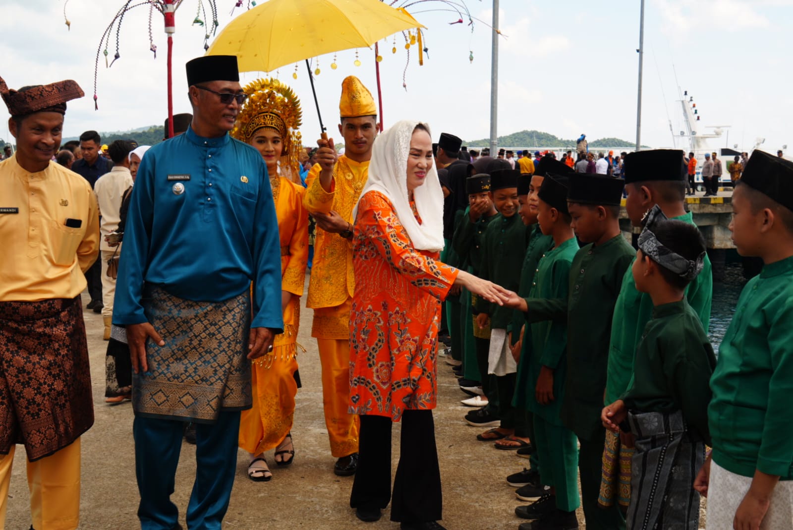 Kedatangan Bupati Natuna disambut meriah oleh masyarakat Serasan yang berkumpul di area pelabuhan depan PLBN Serasan. Suasana penyambutan berlangsung hangat dan semarak dengan penampilan kesenian solat tradisional dan iringan musik khas daerah, mencerminkan antusiasme serta dukungan penuh masyarakat terhadap kemajuan pariwisata Natuna. Minggu, (15/06/2025).